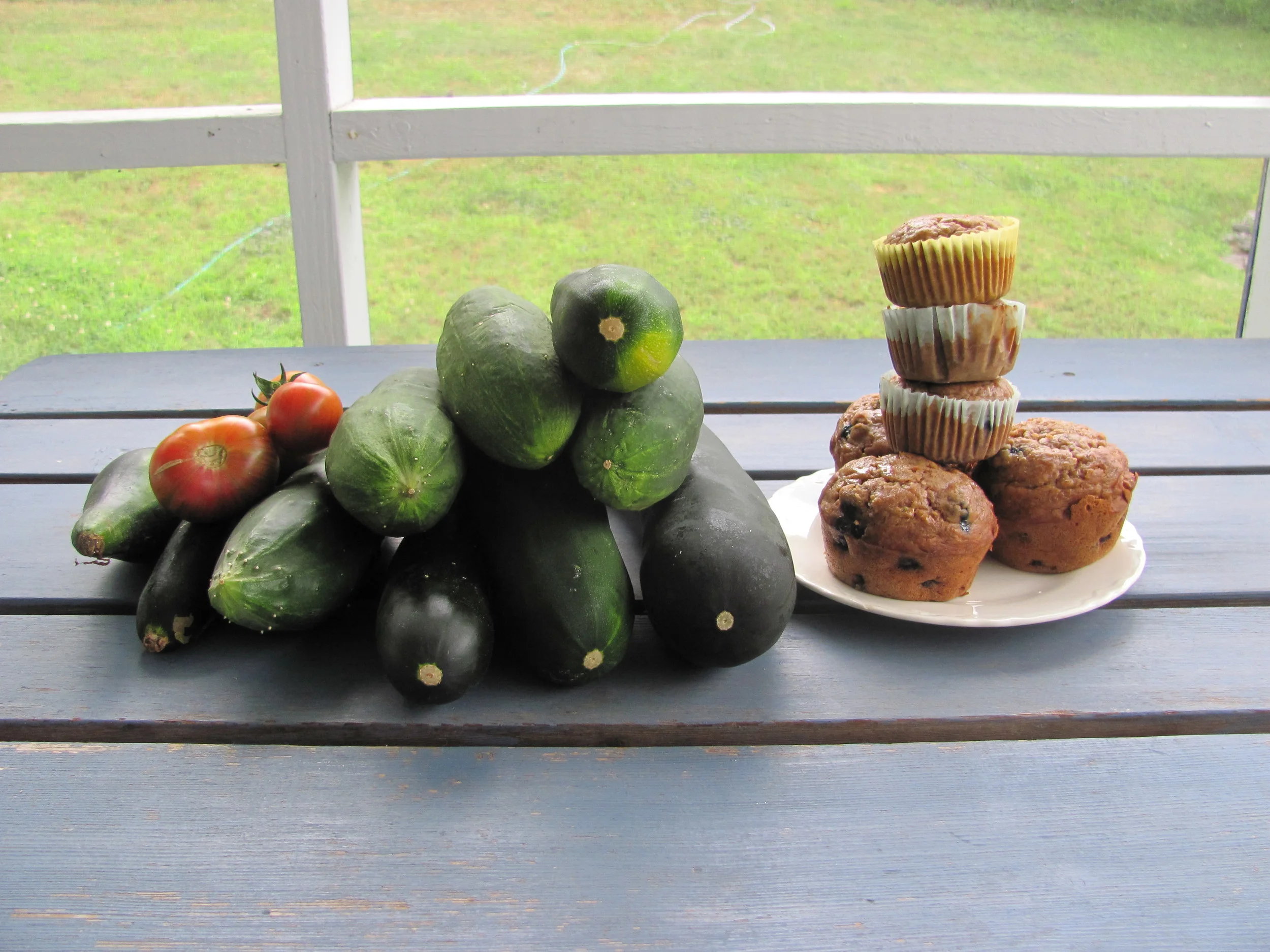 Our absent hosts, whose home we are enjoying perhaps too thoroughly, have an excellent little veggie garden bursting with produce. "Eat some zucchini!" they ordered us on the way out the door. And wanting to be invited back next year, we did. We've sliced it into tacos, we've chopped it into frittatas, we've grated it into muffins, we've blended it into breads, we've sent some home with visitors and we've (I've) used it as a prop in an off-off-off-Broadway production of Our Town.